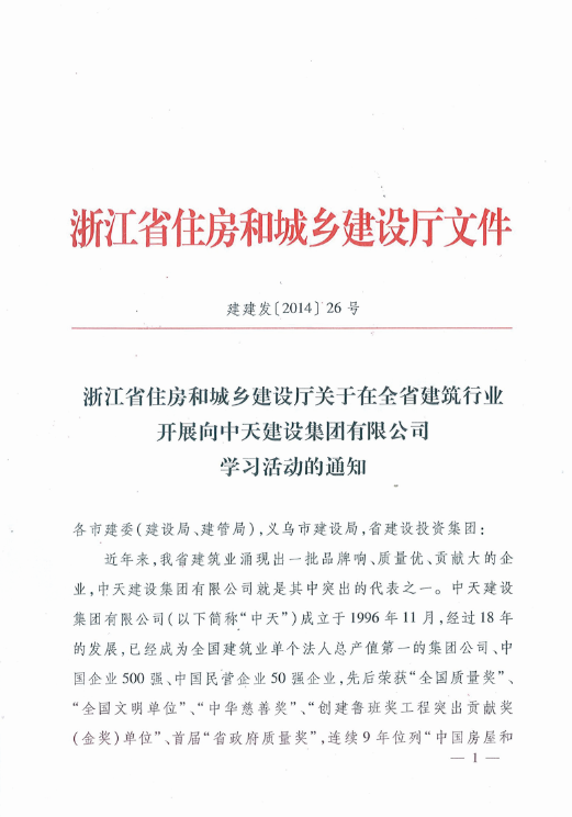 《浙江省住房和城乡建设厅关于在全省建筑行业开展向豪运国际建设集团有限公司学习活动的通知》